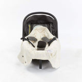 The Kura Organic Baby wrap has a clever opening in the back that allows the harness to be pulled through to the inside, ensuring that the harness remains in the correct position and is fastened directly on to baby's chest. As our wrap is closed over the top of the harness, there is only one thin layer of non-compressible material in the back and no padded layer is added between your baby and the car seat harness.